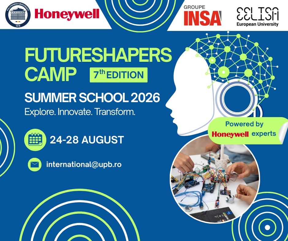 Summer schools FutureShapers Camp 2026 FIND OUT FutureShapers Camp 2025 FIND OUT FutureShapers Camp 2024 FIND OUT FutureShapers Camp 2023 FIND OUT POLITEHNICA Bucharest & Groupe INSA 2022 FIND OUT POLITEHNICA Bucharest&AUF - Sustainable Development 2020 FIND OUT Admissions Study Offers Applying Continuing Education Summer Schools Language Courses