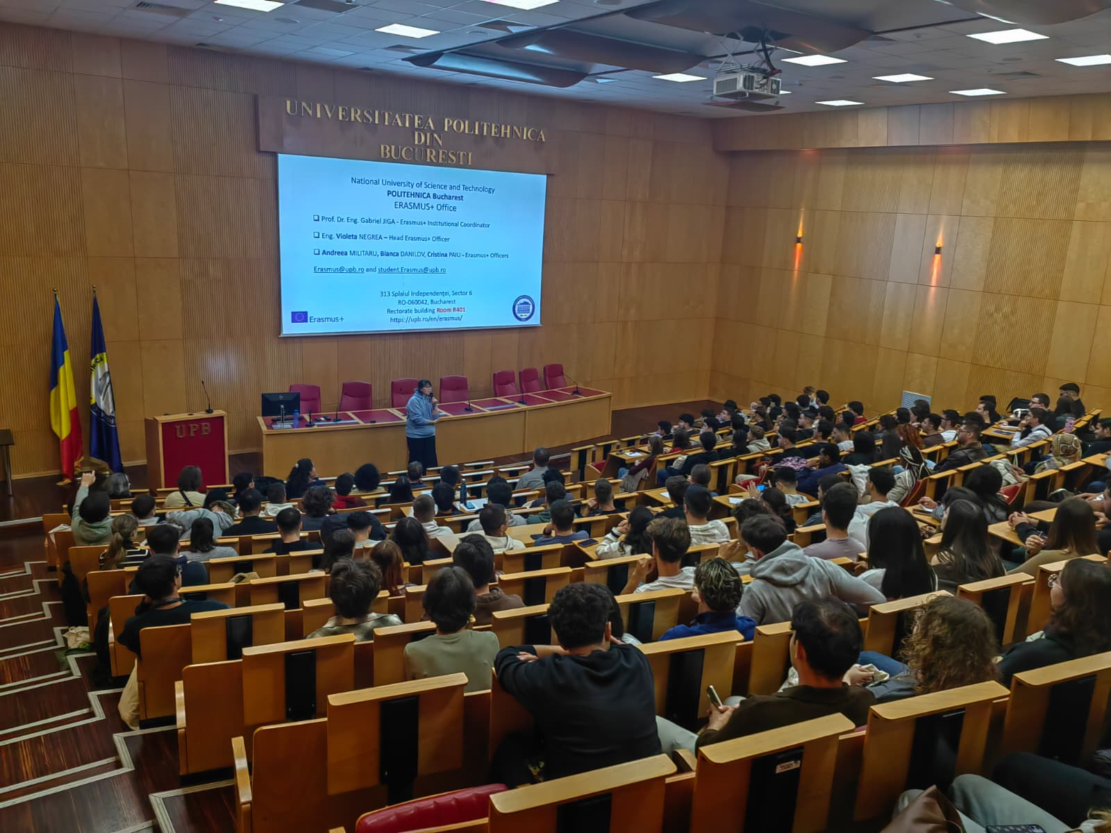 On September 29, POLITEHNICA Bucharest welcomed its newest international students during the Erasmus Orientation Meeting. The event marked the beginning of an exciting academic and cultural journey for students arriving from partner universities across Europe and beyond. Designed to support their transition and integration, the orientation offered essential guidance on academic procedures, campus life, and the practical aspects of studying and living abroad.